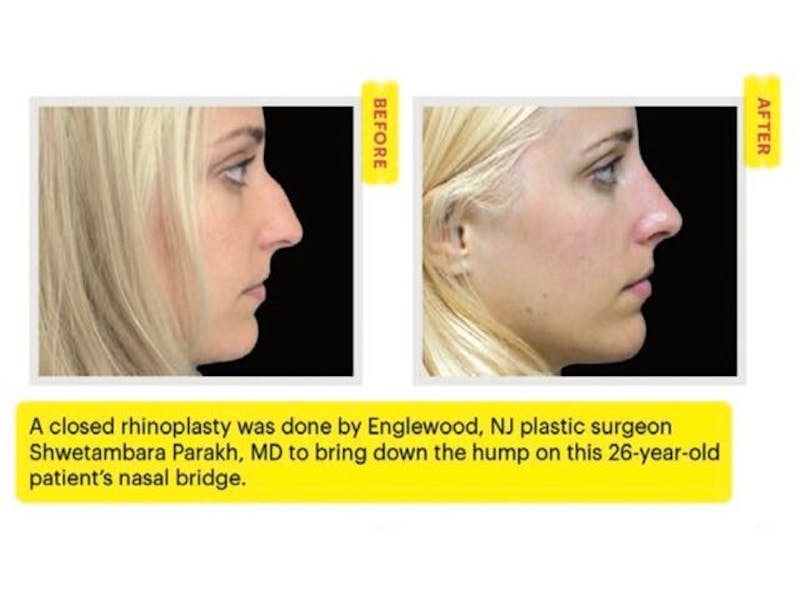 A closed rhinoplasty was done by Englewood, NJ plastic surgeon Shwetambara Parakh, MD to bring down the hump on this 26-year-old patient’s nasal bridge.